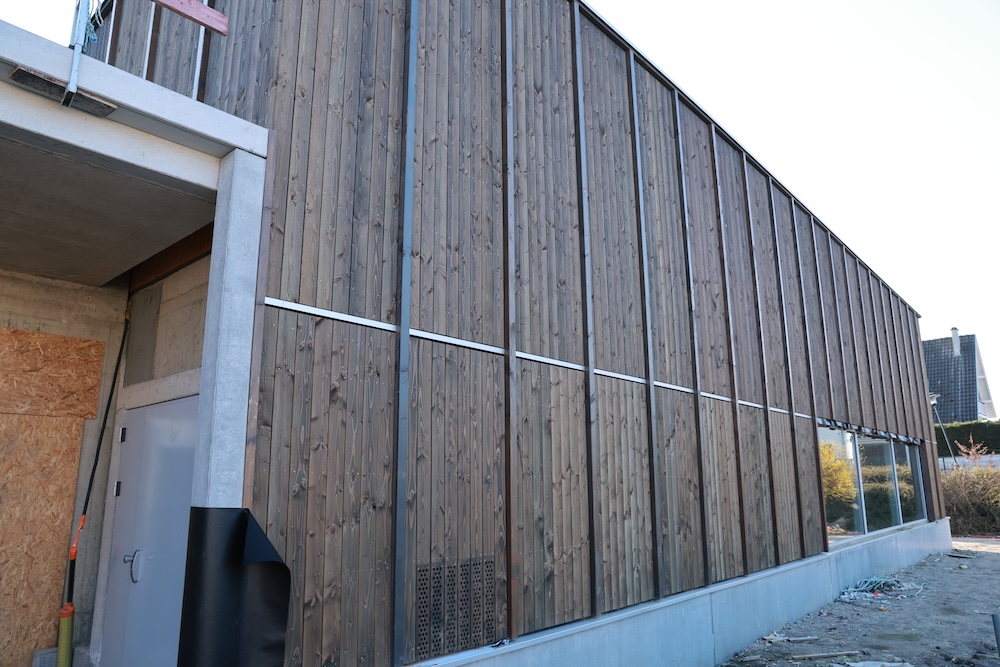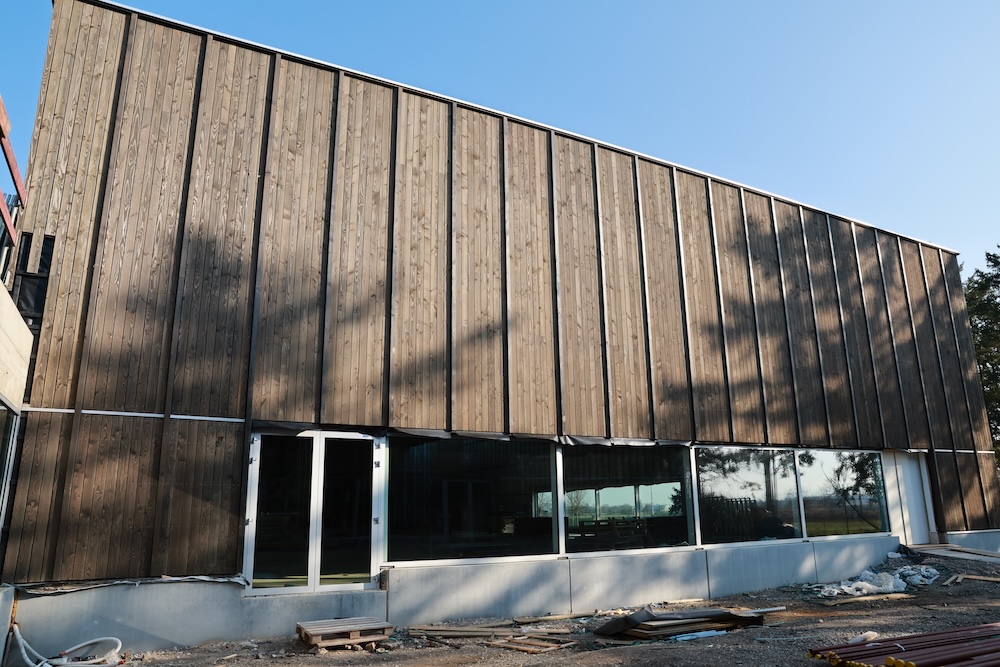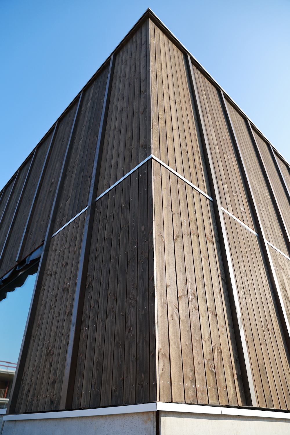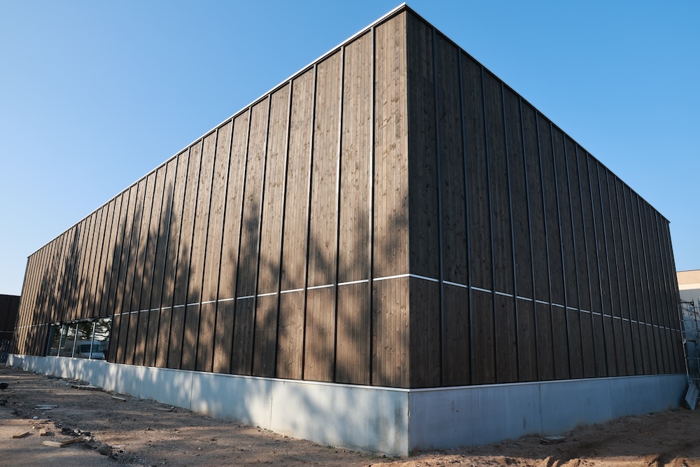 Le dojo s’appuie sur une structure poteaux-poutres bois franchissant une portée de 18 mètres. Les façades comprennent environ 600 m² de murs à ossature bois, préassemblés sur site, atteignant jusqu’à 8 mètres de hauteur : un défi technique relevé avec précision.