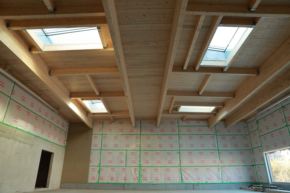 Le gymnase repose sur une hyperstructure en bois lamellé-collé à inertie variable, avec une portée impressionnante de 24 mètres. Les façades intègrent près de 1 000 m² de murs à ossature bois, préfabriqués en atelier et livrés finis, garantissant précision d’exécution et maîtrise des délais.