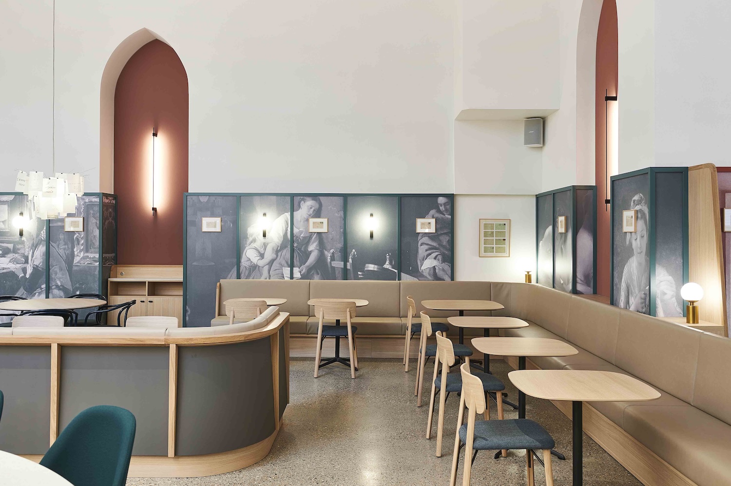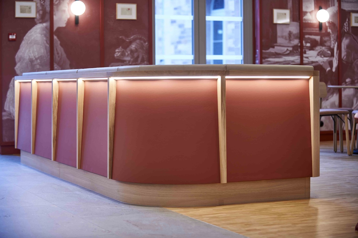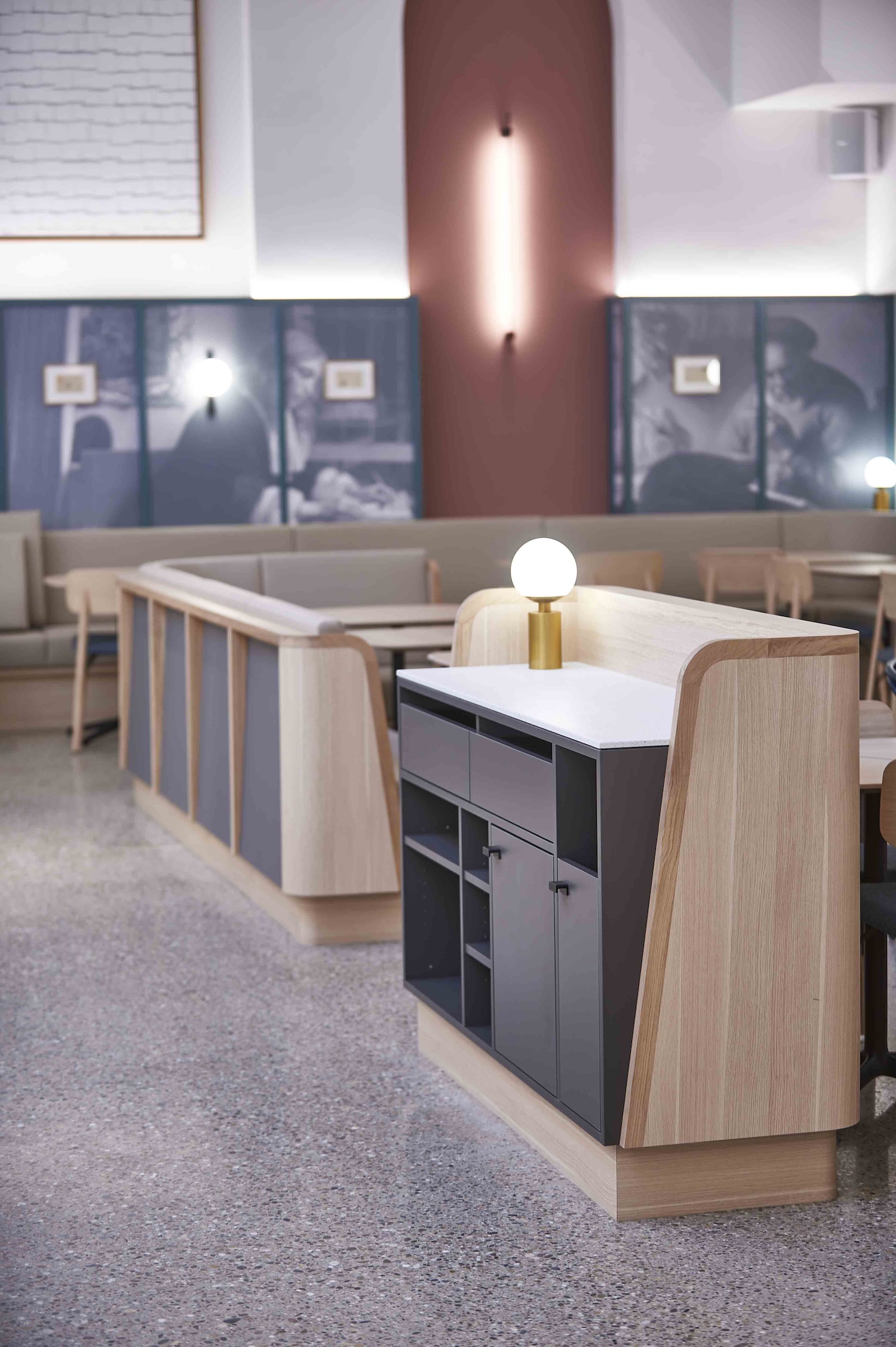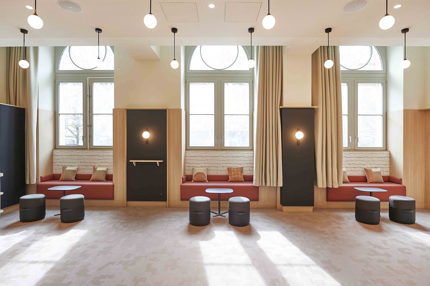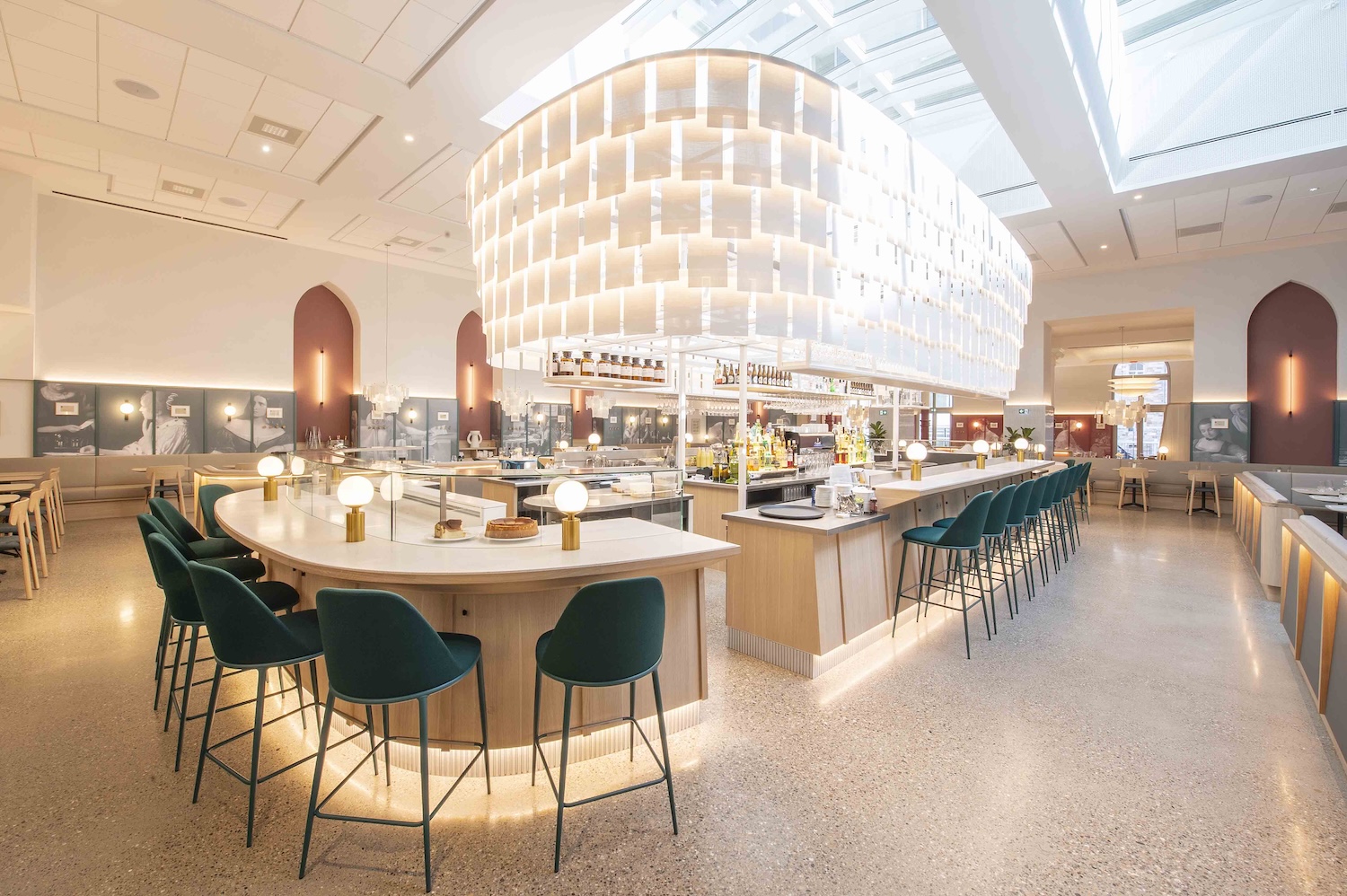 Derrière le décor feutré, une technicité de haut vol : restructuration lourde, isolation acoustique haute performance, intégration d’équipements techniques invisibles, finitions millimétrées. Sol en béton poli, bar monumental de 12 mètres, tissus acoustiques sur mesure, enduits au sable de marbre : chaque matière a été choisie pour conjuguer durabilité, esthétisme et confort sonore.