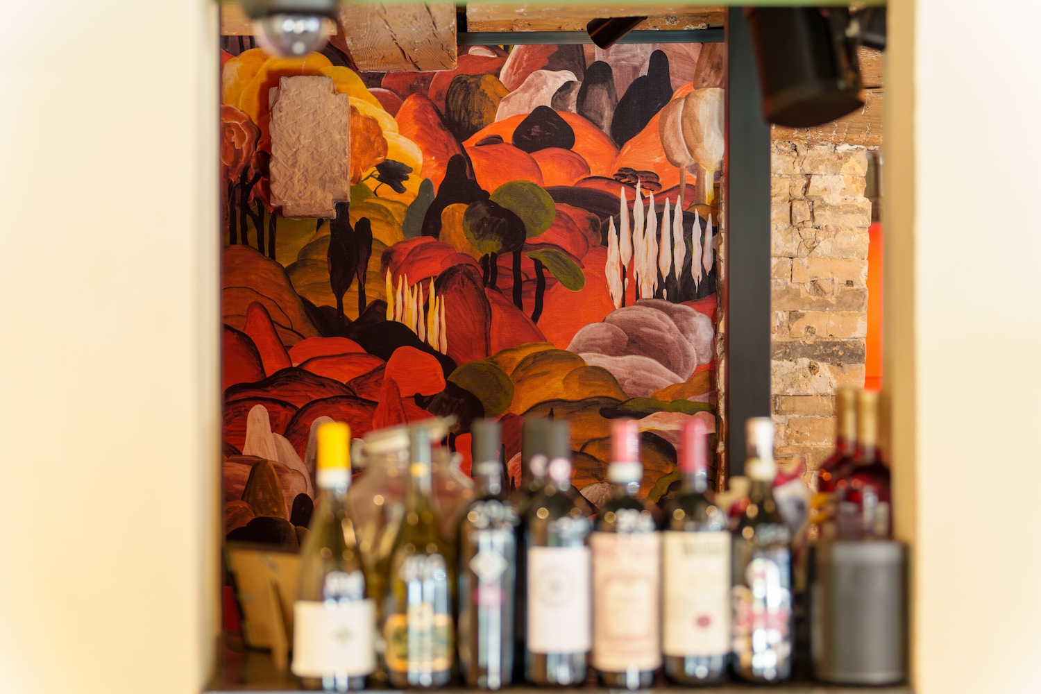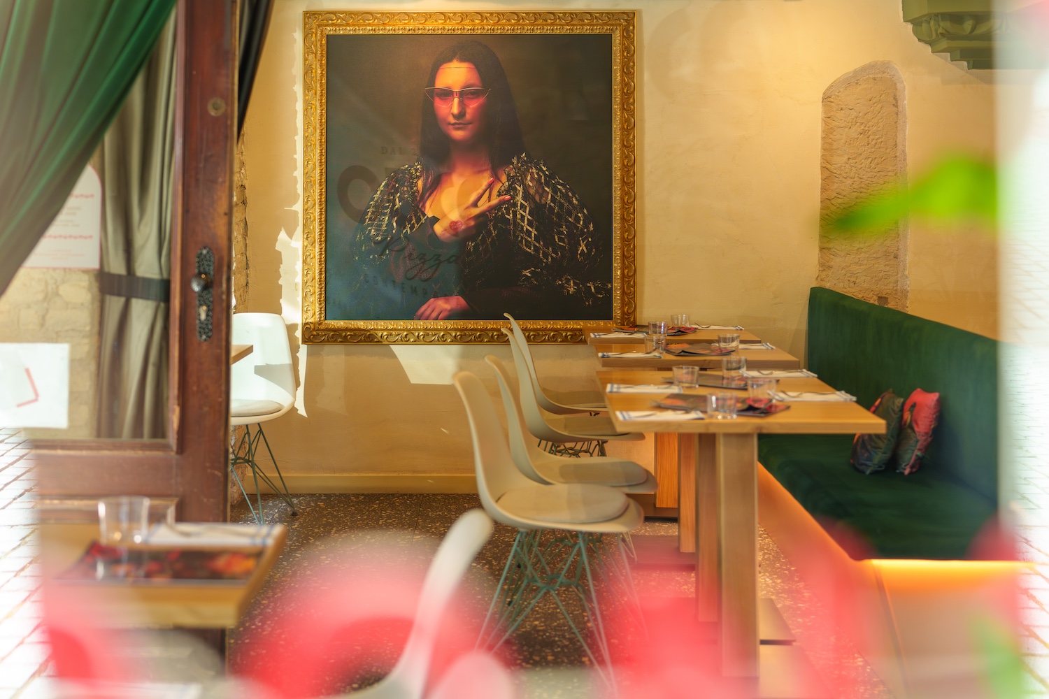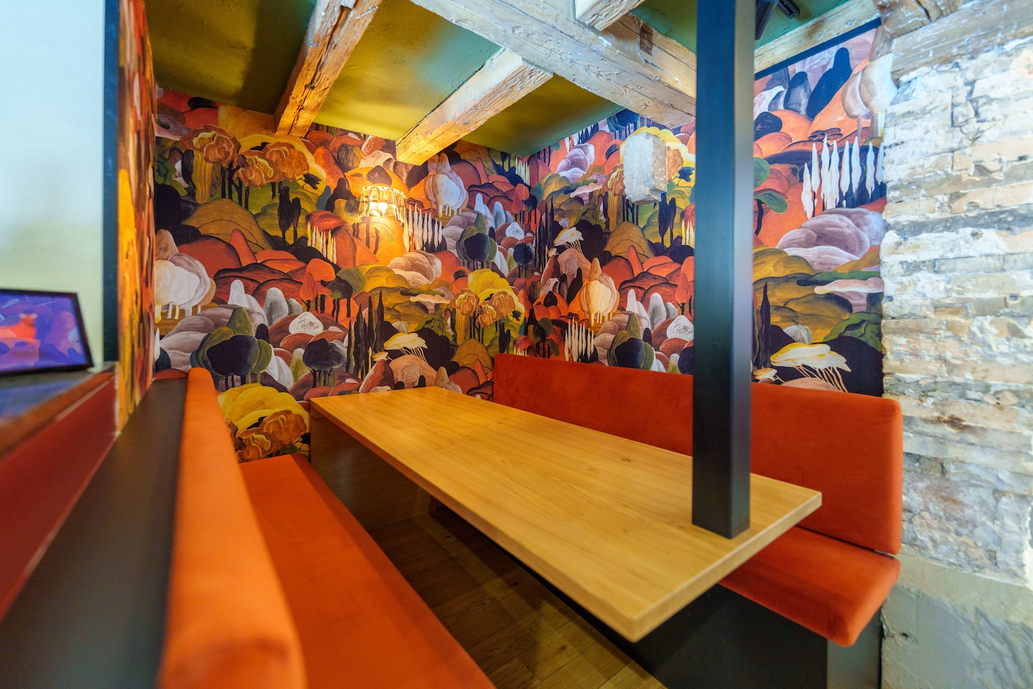 Pour sublimer cette vision, les designers du STUDIO PETIT MARTIN ont façonné un décor profondément chaleureux, où chaque détail résonne comme une invitation au voyage. L’alcôve habillée d’un papier peint évoquant les collines toscanes côtoie les enduits colorés et vibrants, créant un contraste subtil avec les pierres anciennes mises à nu lors de la rénovation, un hommage délicat aux ruelles de Naples, baignées de lumière et d’authenticité.