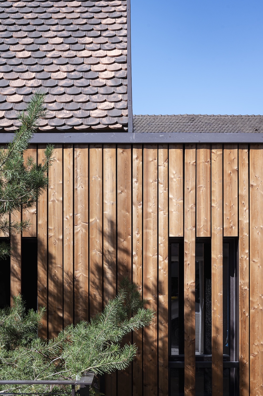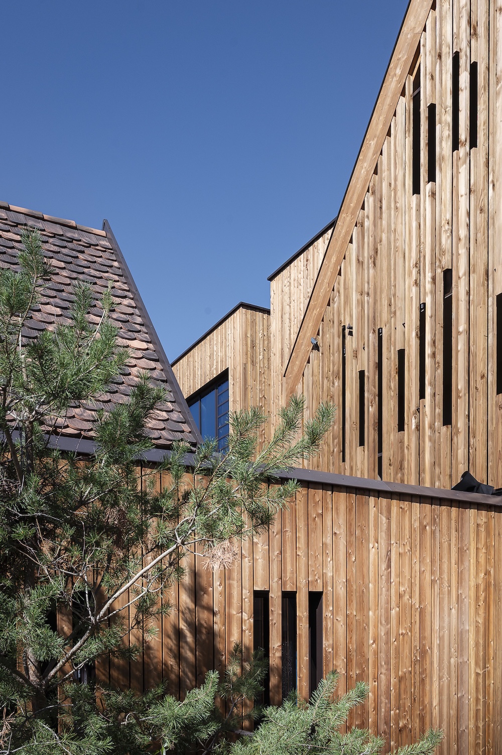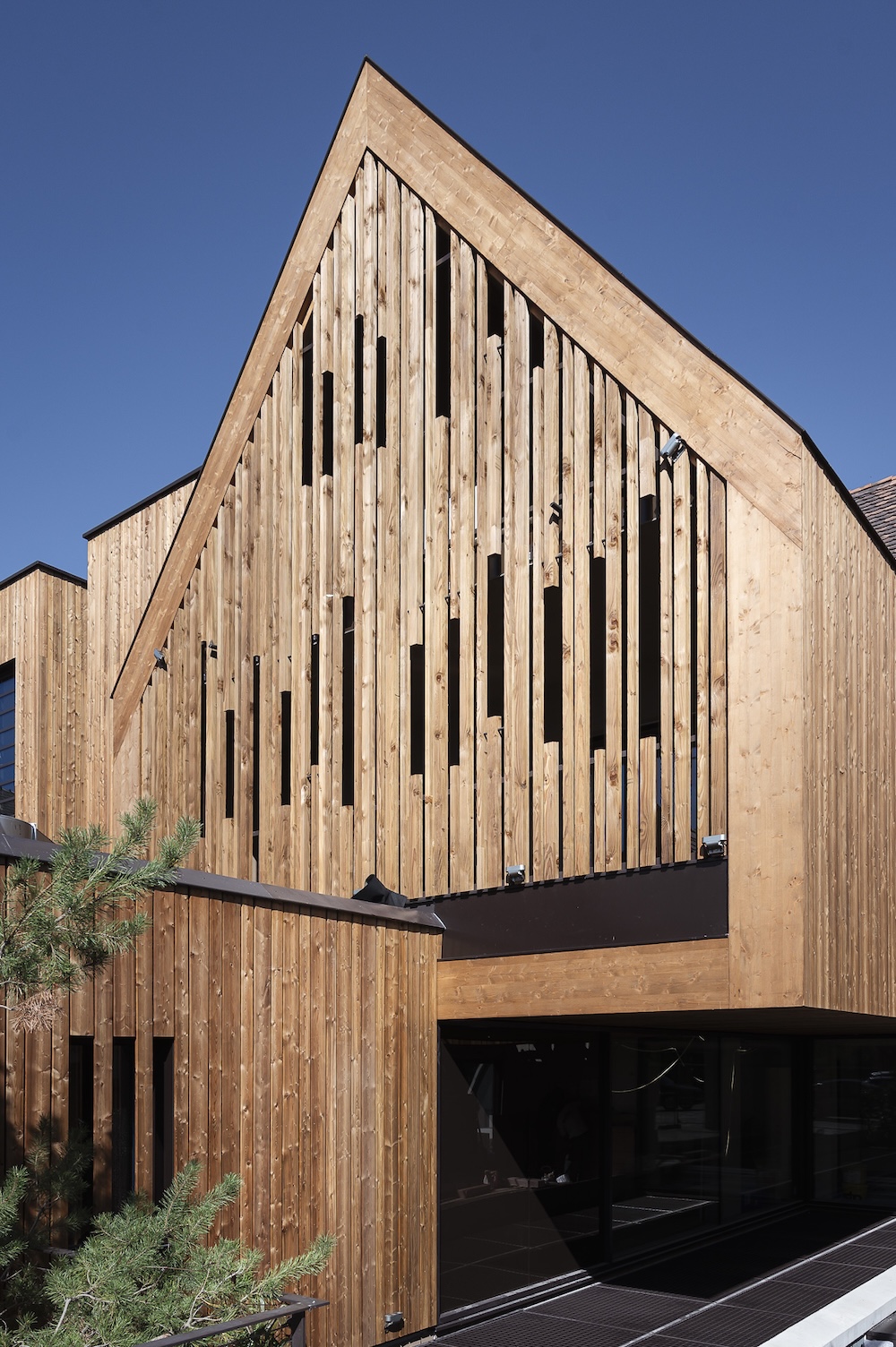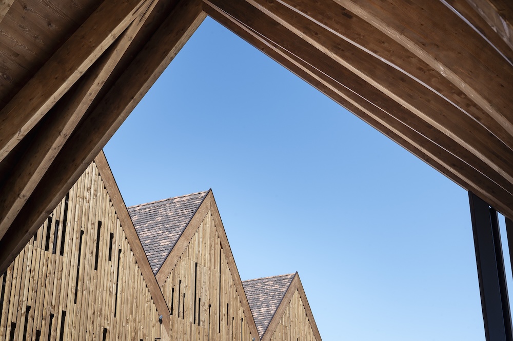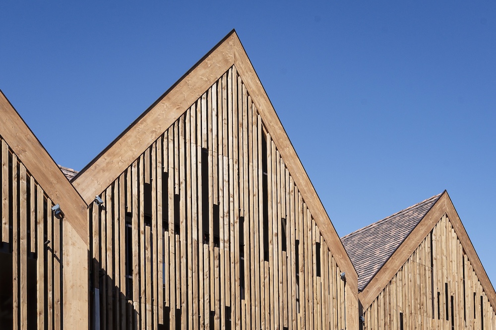 Façades hôtel : alternant bardage ajouré et charpente traditionnelle, elles créent des jeux de lumière et une ligne épurée.