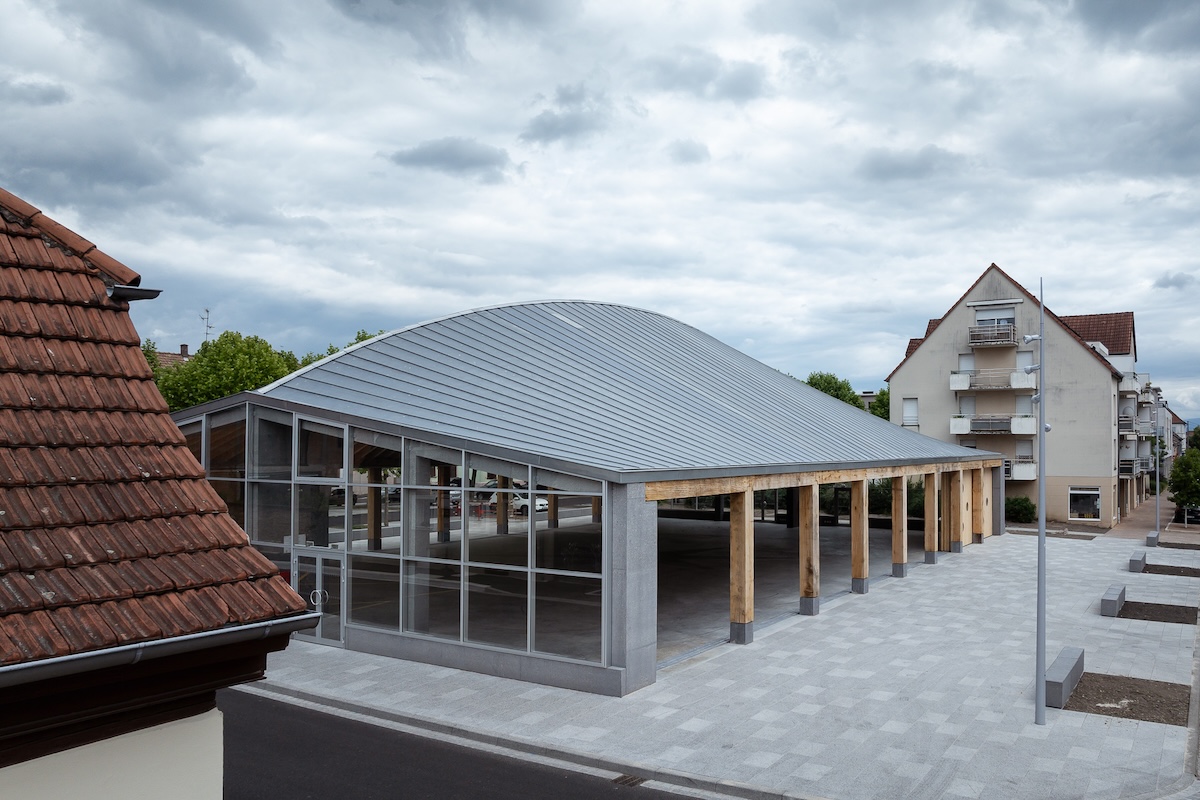 Sur la place de la Liberté à Bischwiller, cette halle couverte d’environ 700 m² a été imaginée pour accueillir le marché hebdomadaire et des événements culturels et associatifs, dans le cadre d’une stratégie de redynamisation et de valorisation du centre-ville portée par la Ville.
