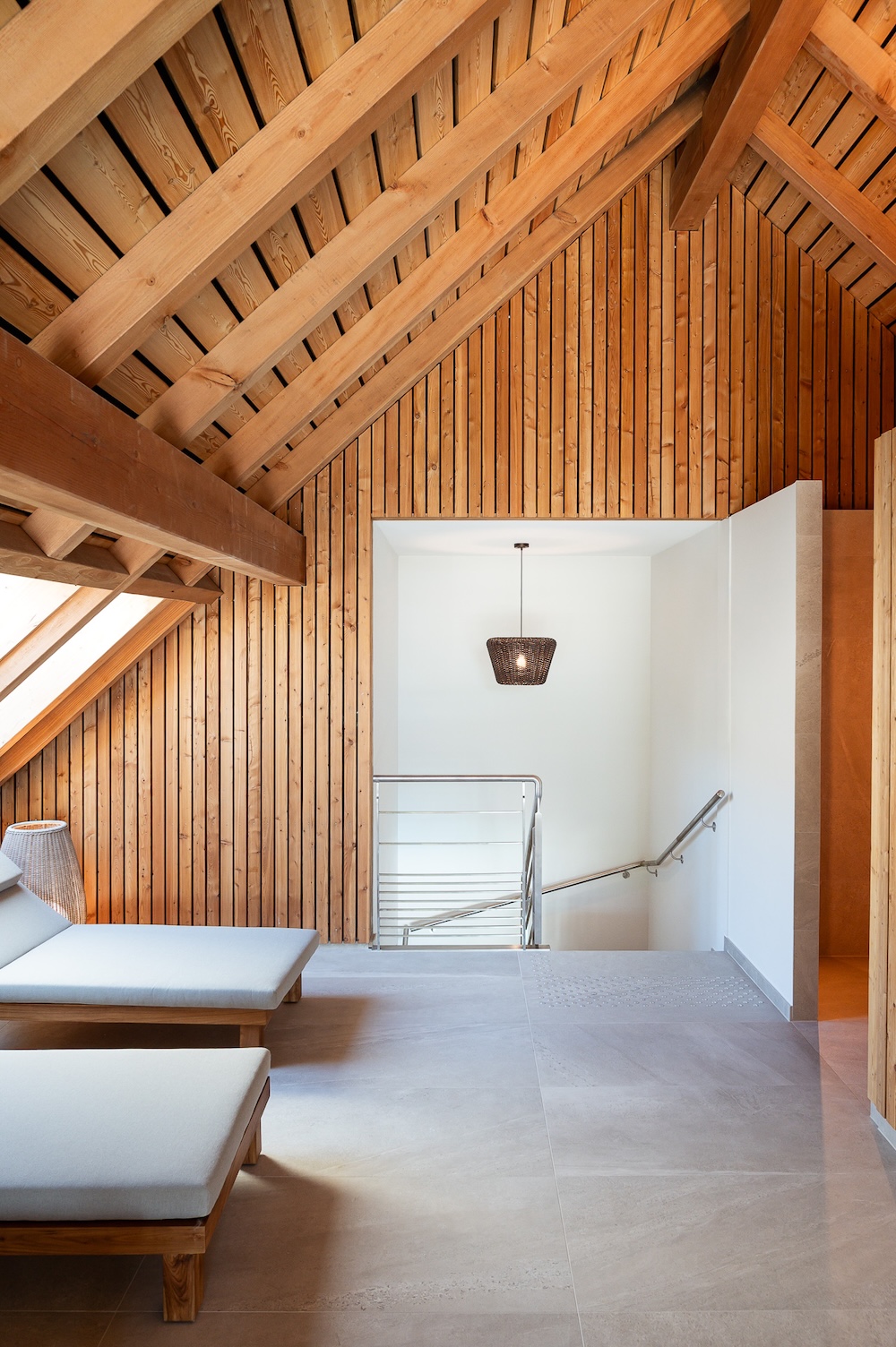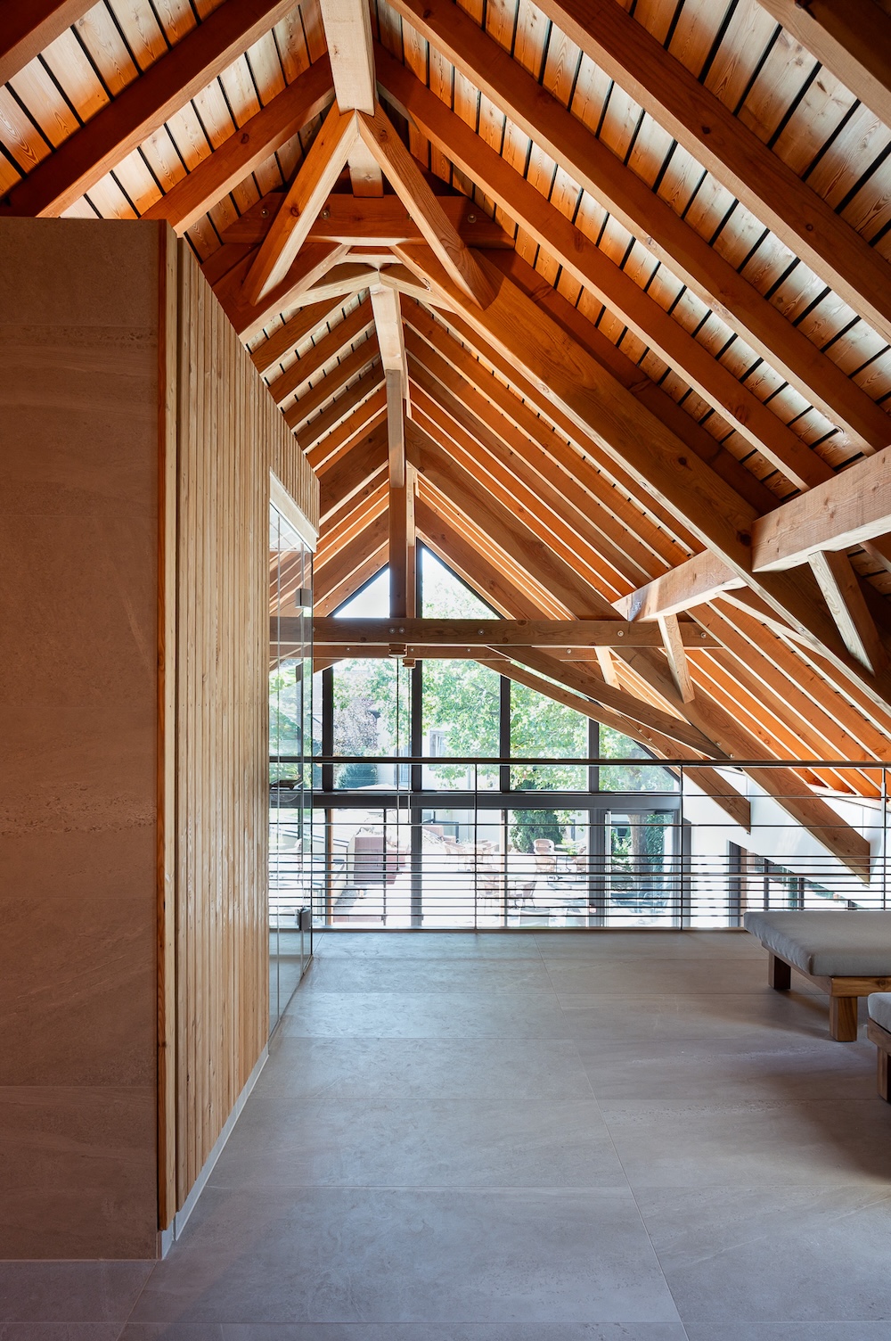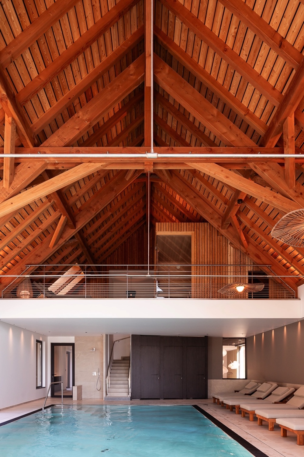 - La piscine : une charpente apparente en bois, conçue pour les contraintes d’humidité, créant une atmosphère chaleureuse et enveloppante.