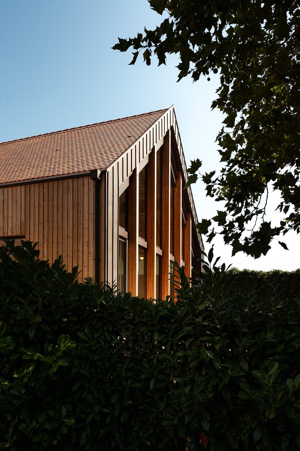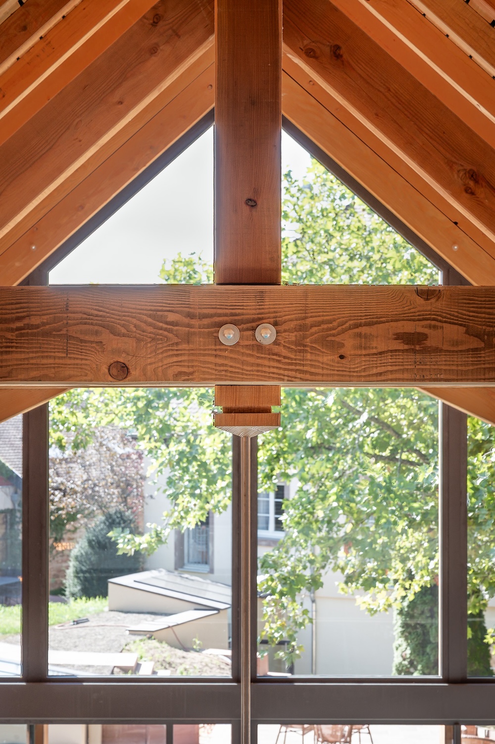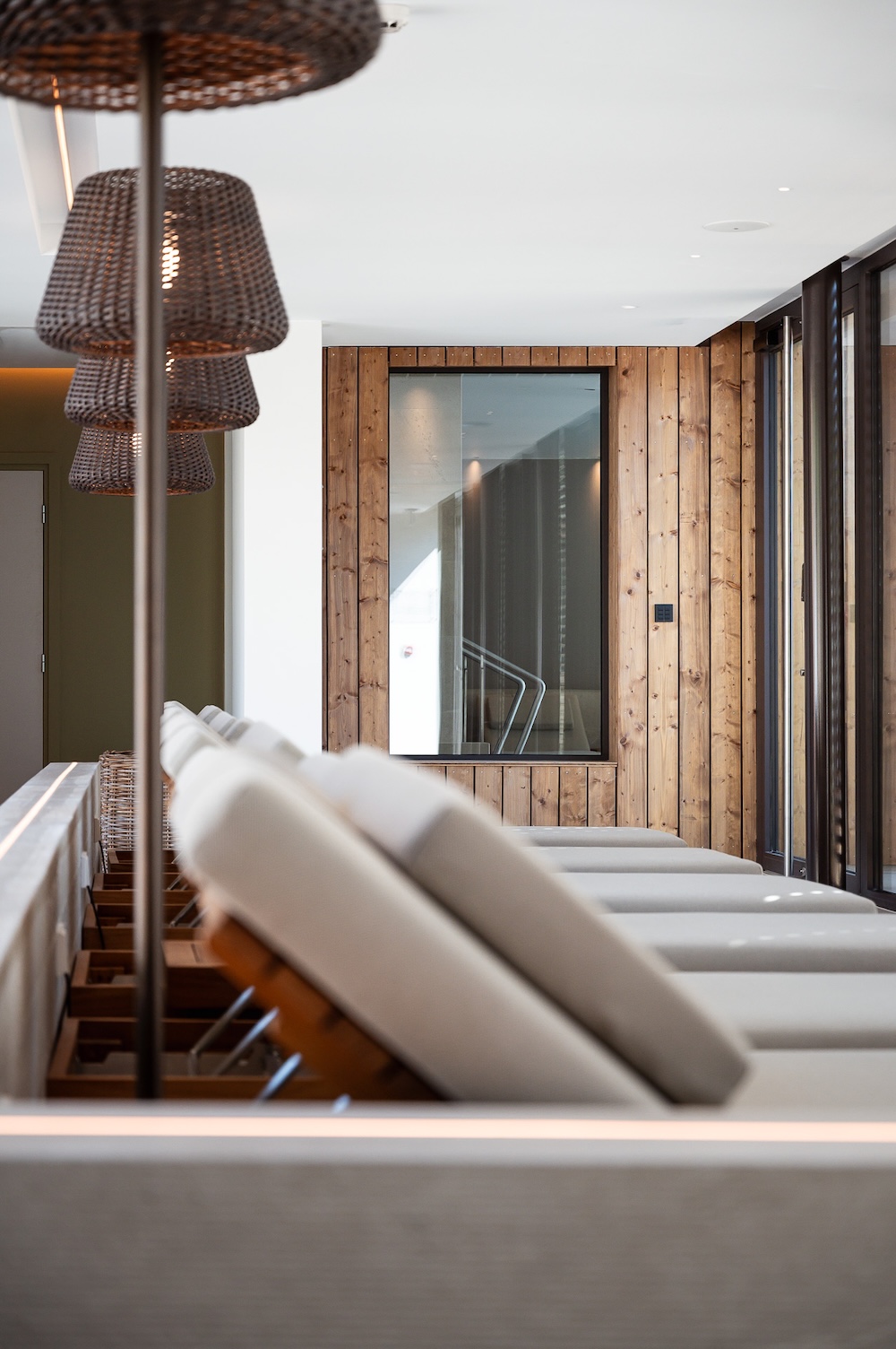 - La piscine : une charpente apparente en bois, conçue pour les contraintes d’humidité, créant une atmosphère chaleureuse et enveloppante.