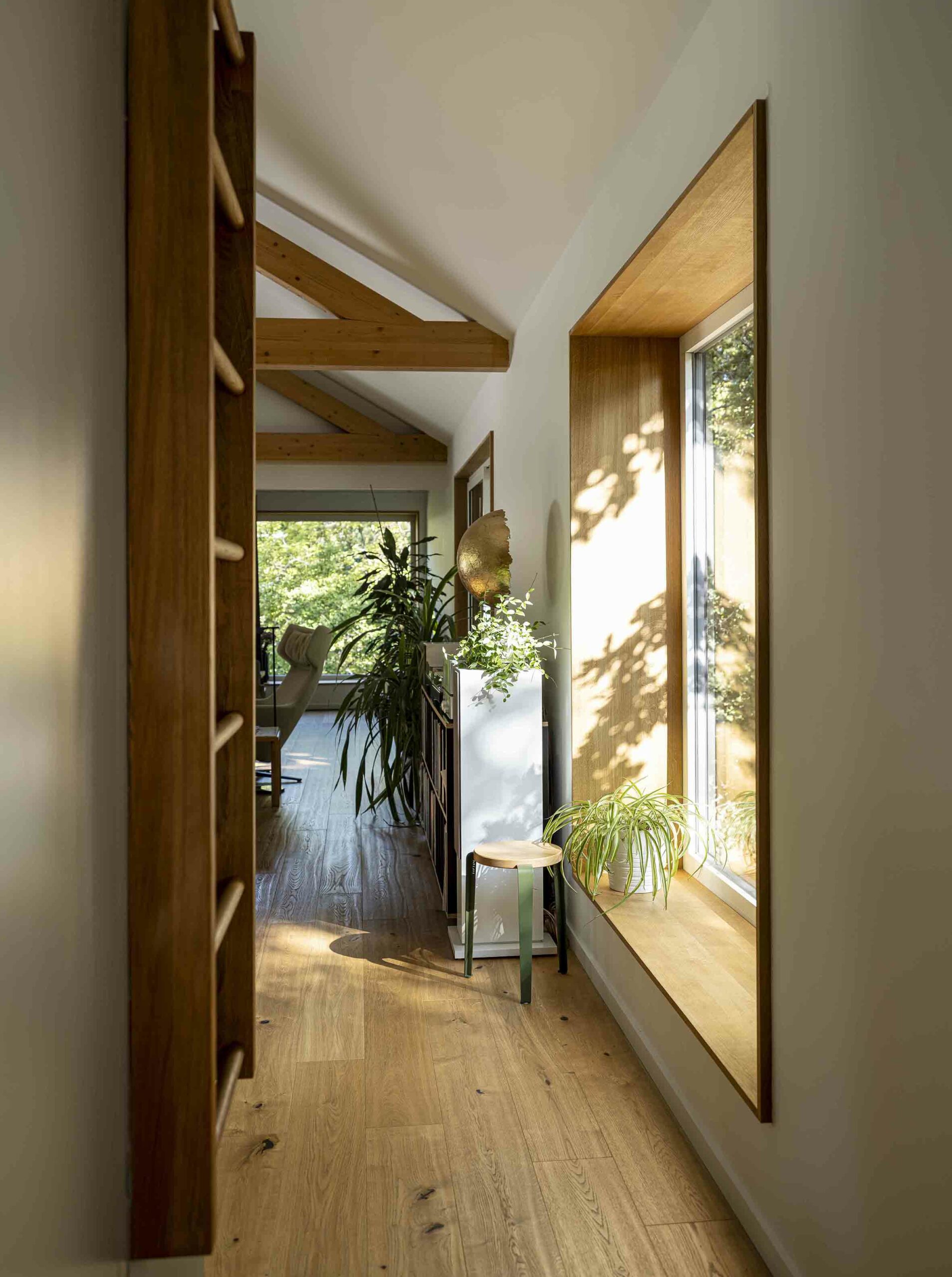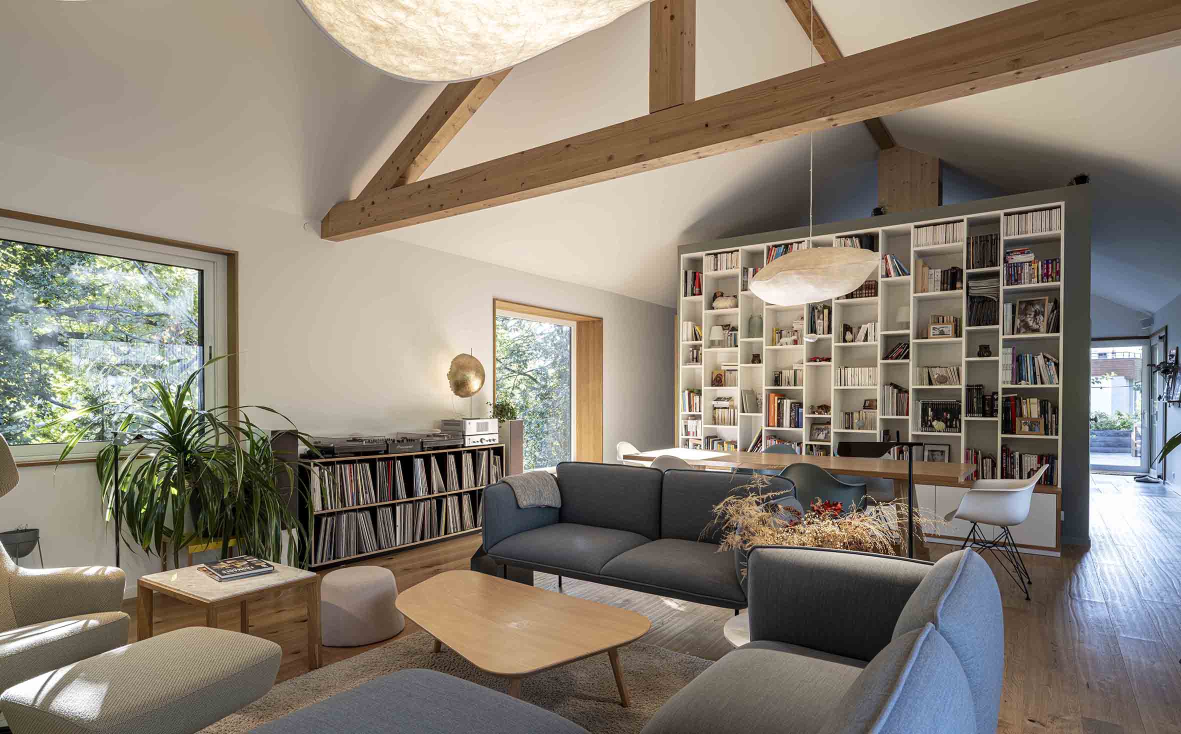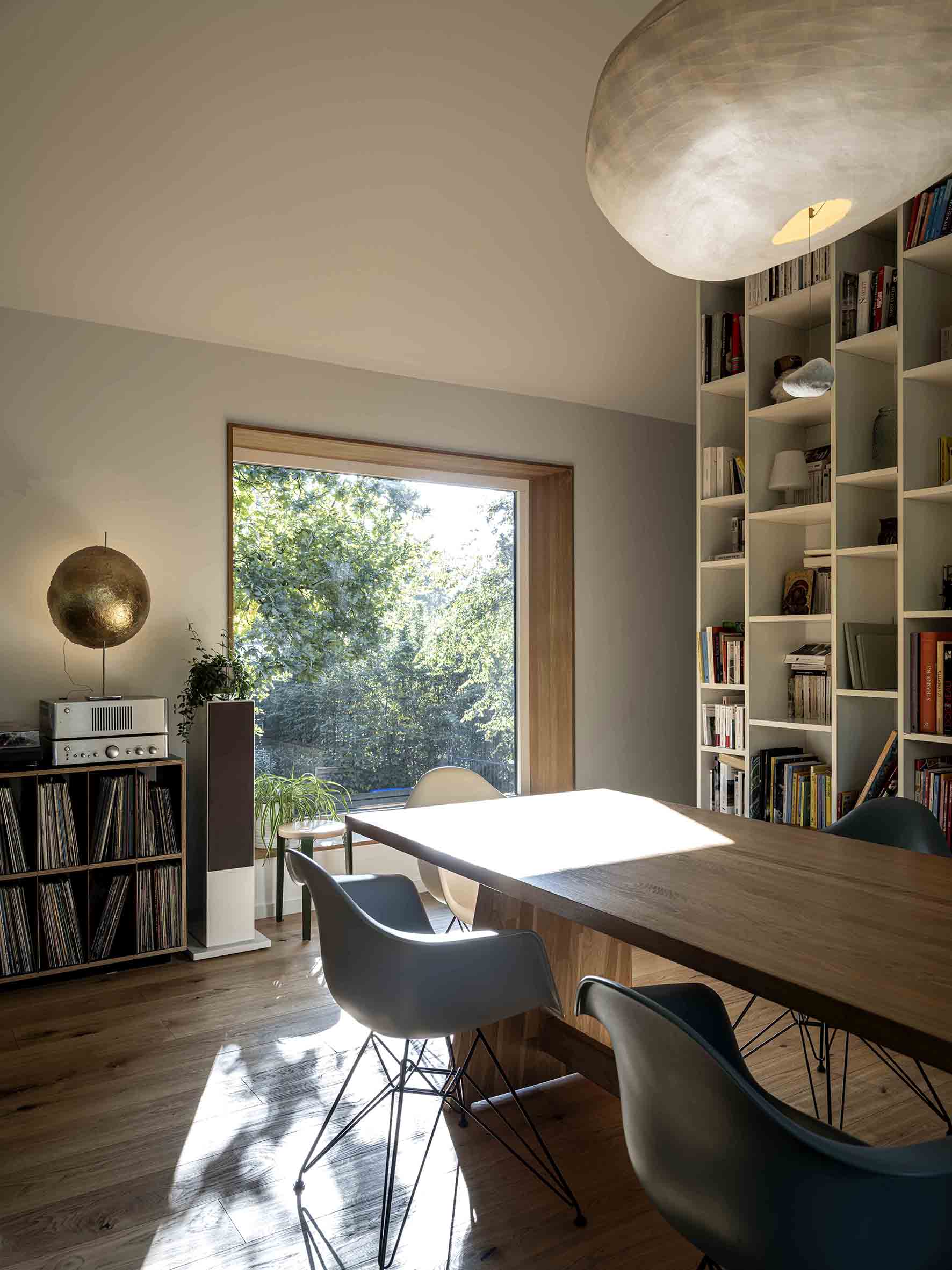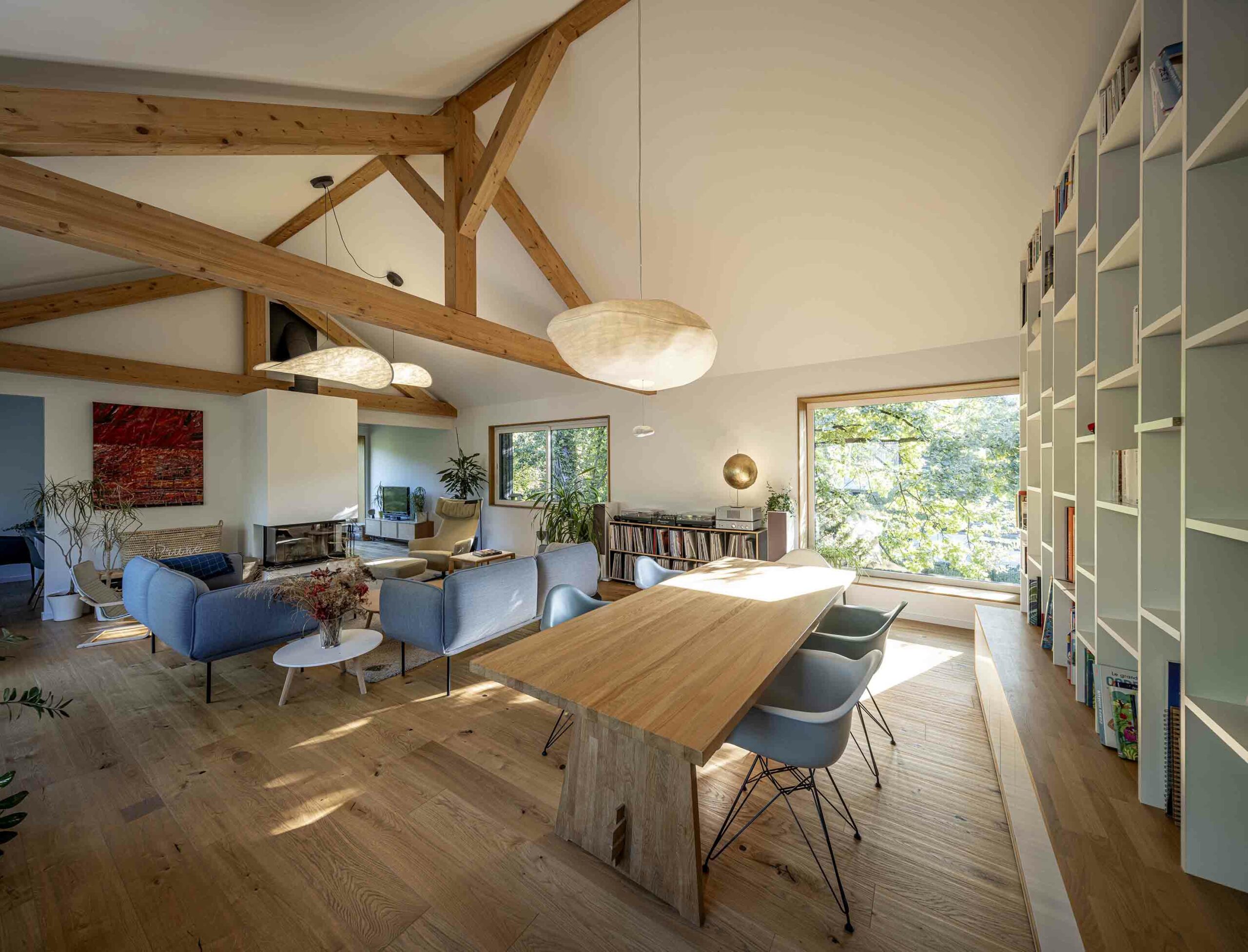Les mobiliers ont été dessinés sur mesure : dressing, bibliothèque, cuisine mariant granit et chêne, ainsi qu’un escalier habillé de chêne avec garde-corps travaillé. Nos menuisiers ont également conçu les encadrements de fenêtres et les tables de la cuisine, de la salle à manger et du séjour, apportant une véritable signature artisanale à chaque pièce.