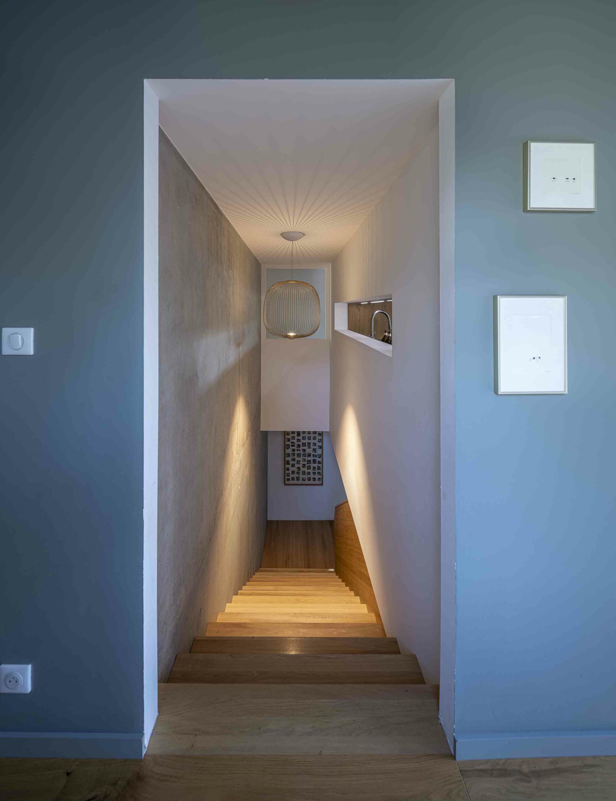 À la suite des travaux de gros œuvre, nous avons pris en charge l’ensemble des finitions intérieures de cette maison familiale. L’ambiance souhaitée chaleureuse, naturelle, tournée vers le bois et la pierre plutôt que le carrelage a guidé toute la conception de cette maison contemporaine.