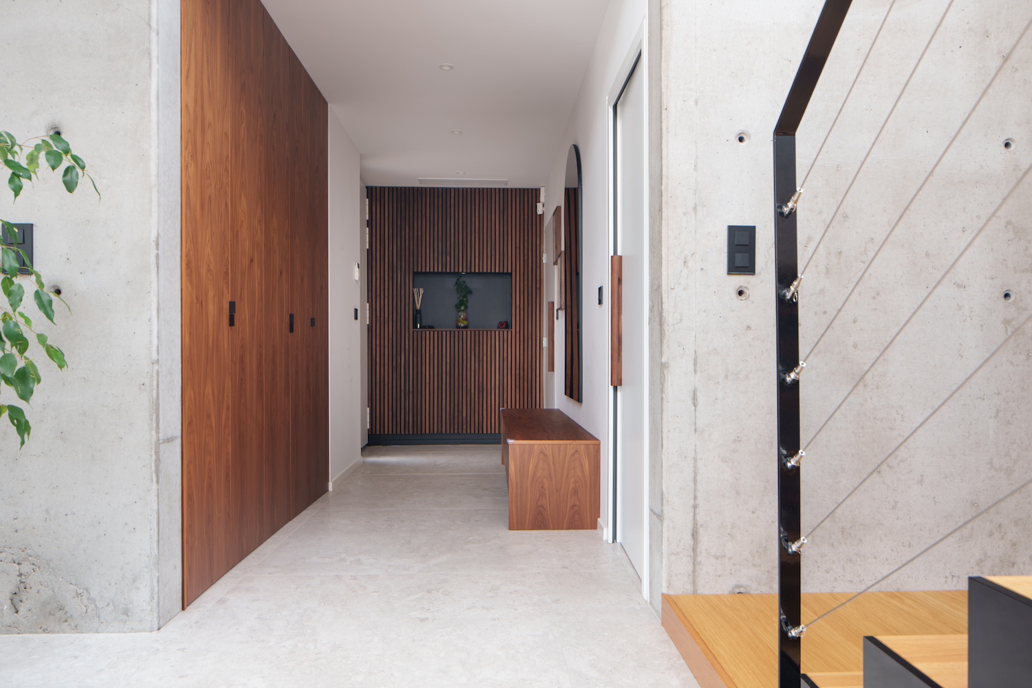 Dans cette maison, toute série d’agencements a été dessinée sur mesure alliant confort, esthétique et fonctionnalité. Dès l’entrée, un meuble en noyer intègre rangements et banc. Le salon se structure autour d’une bibliothèque et d’un meuble bar conçus sur mesure.