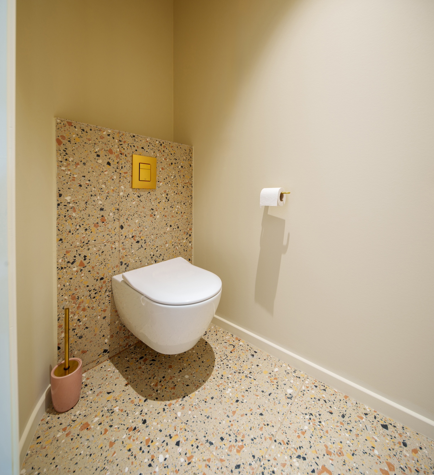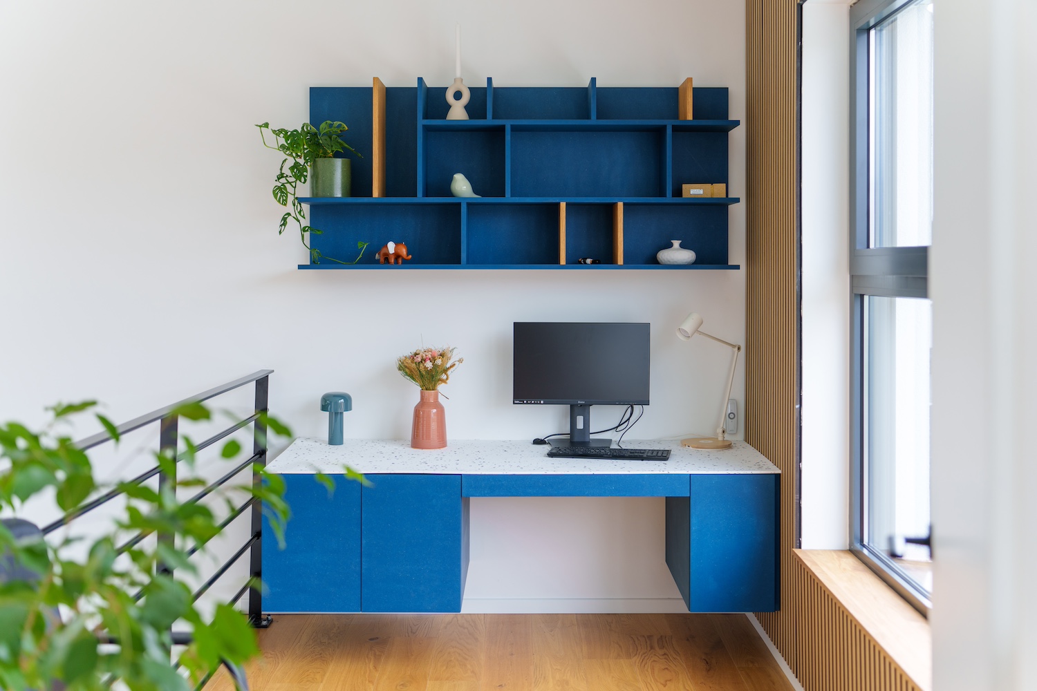 La cuisine (ACEA Agencement) se distingue par un plan en granit du Brésil, tandis que la salle de bain parentale associe meuble en chêne et plan en Corian. Enfin, les espaces bureau en Valchromat bleu intègrent un plan “Le Pavé” en plastique recyclé, pour une touche à la fois design et écoresponsable.