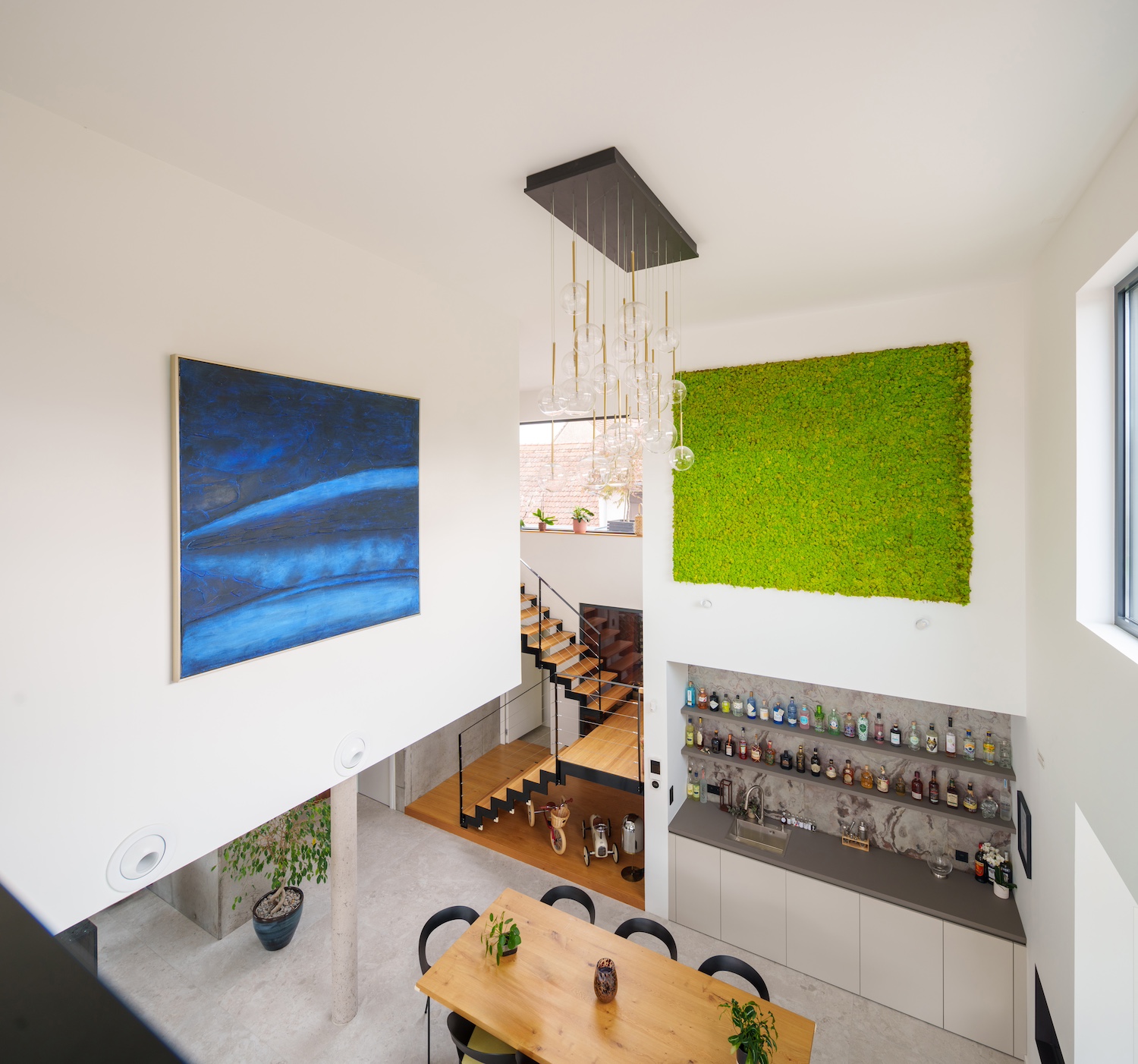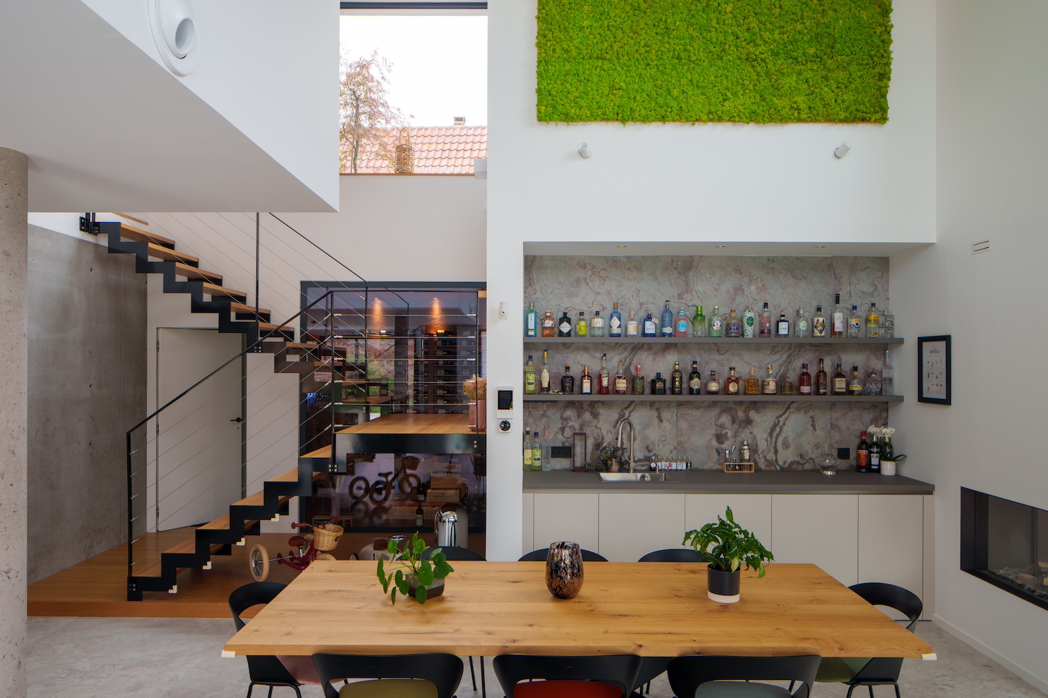 Pièce signature du projet : un escalier associant structure métallique (HOWILLER) et marches/estrade en chêne réalisées par KS Aménagement. À l’arrière, une cave à vin intégrée mêle tubes de cuivre et sol en bois Kebony.
