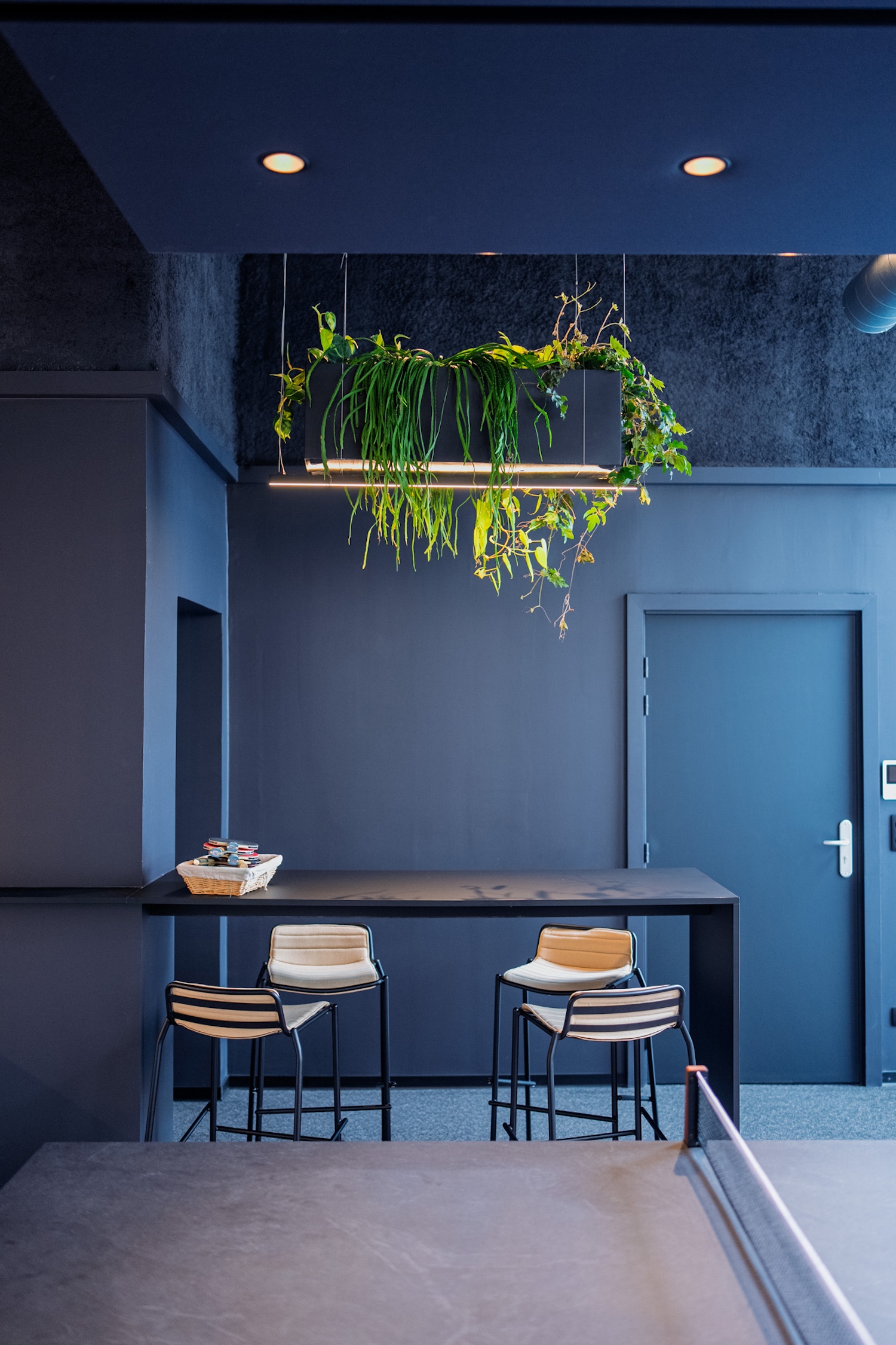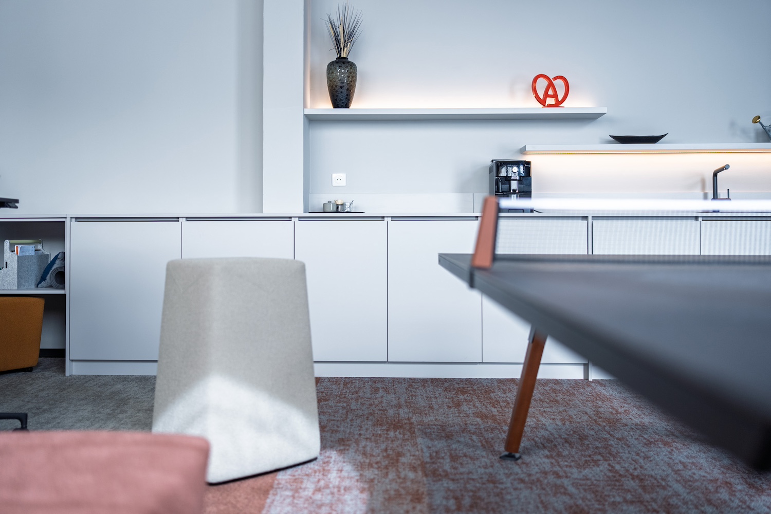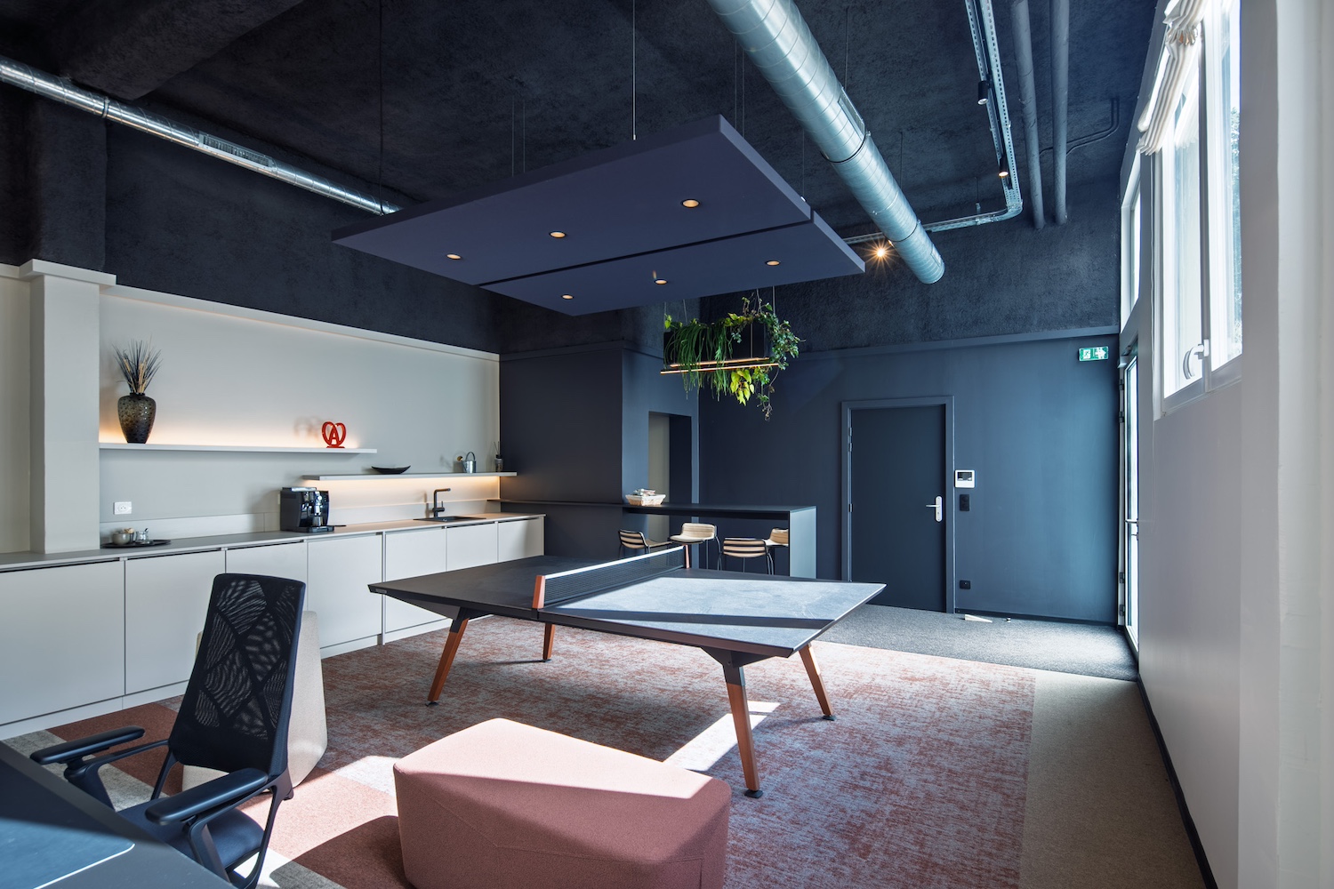 • et une mezzanine coupant la lumière naturelle. Autant de contraintes qui ont été repensées comme des opportunités de créer un lieu singulier, fonctionnel et affirmé.