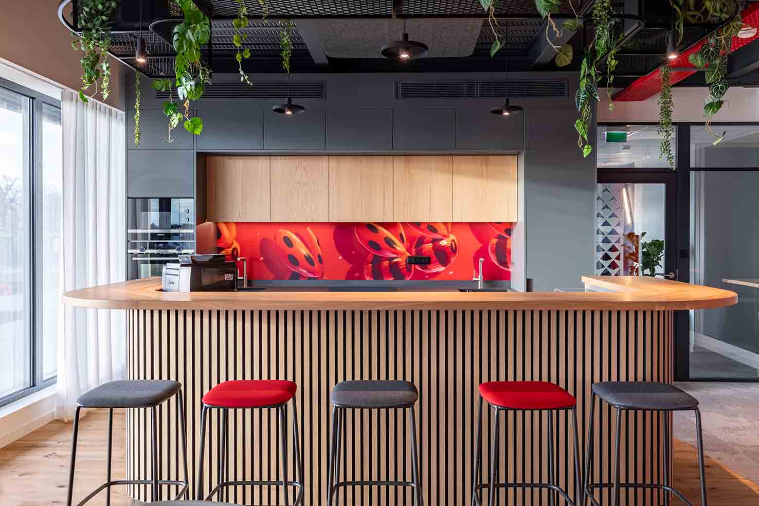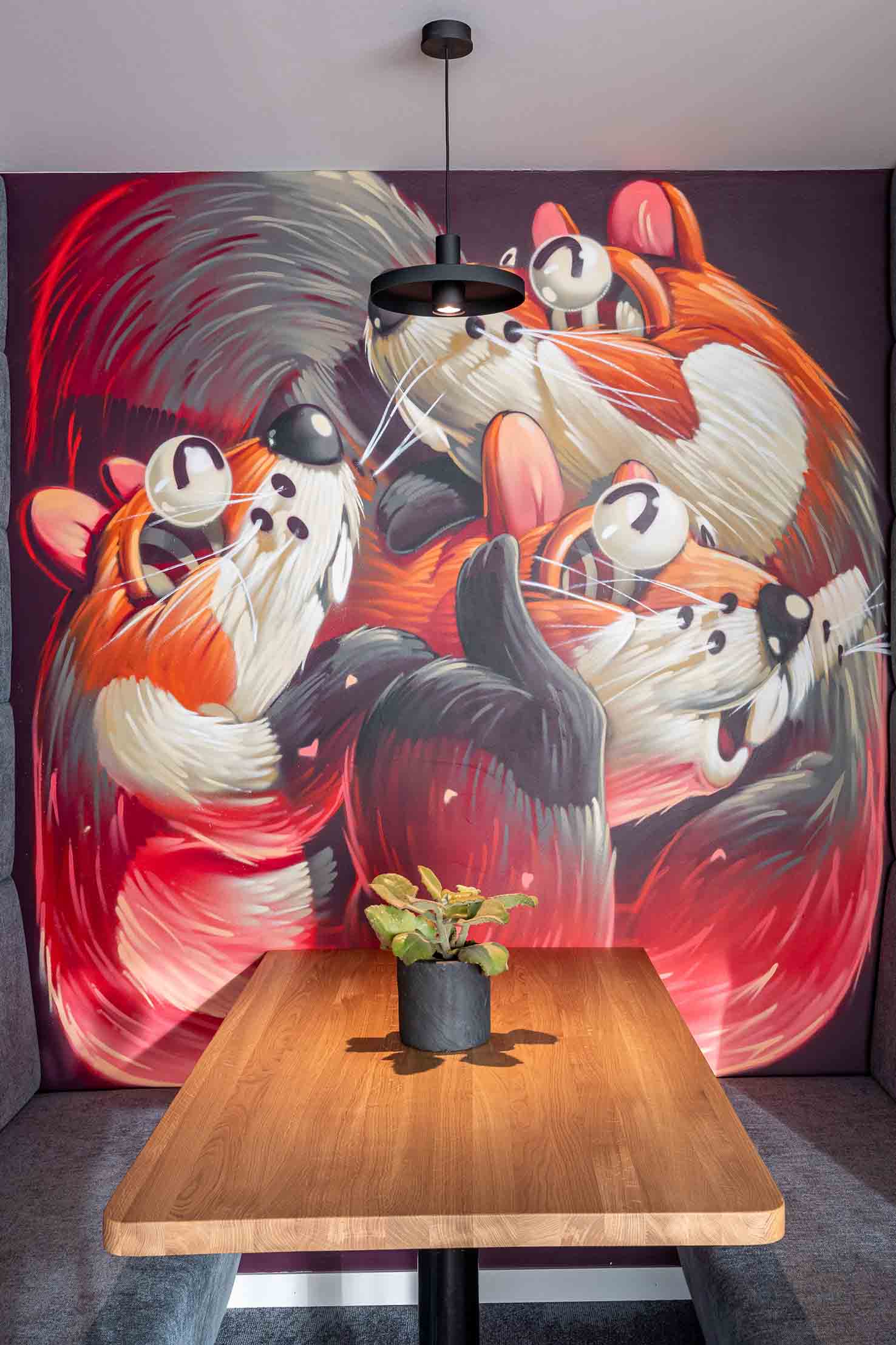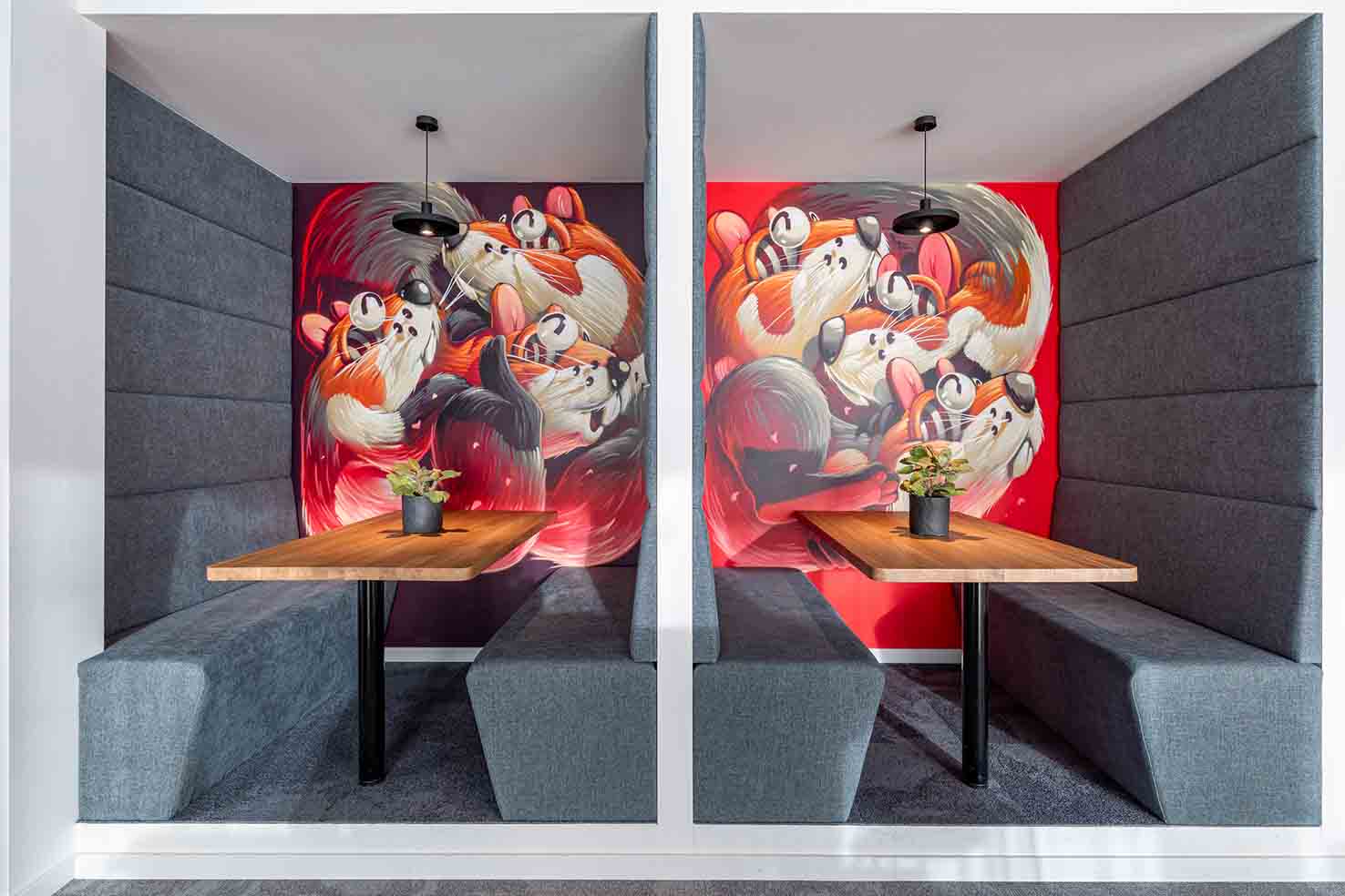 Le graffeur STOM 500 est intervenu pour personnaliser plusieurs zones : alcôves repas du réfectoire, crédence et un mur à l’étage, autour d’un thème alsacien décliné dans le code couleur Würth.