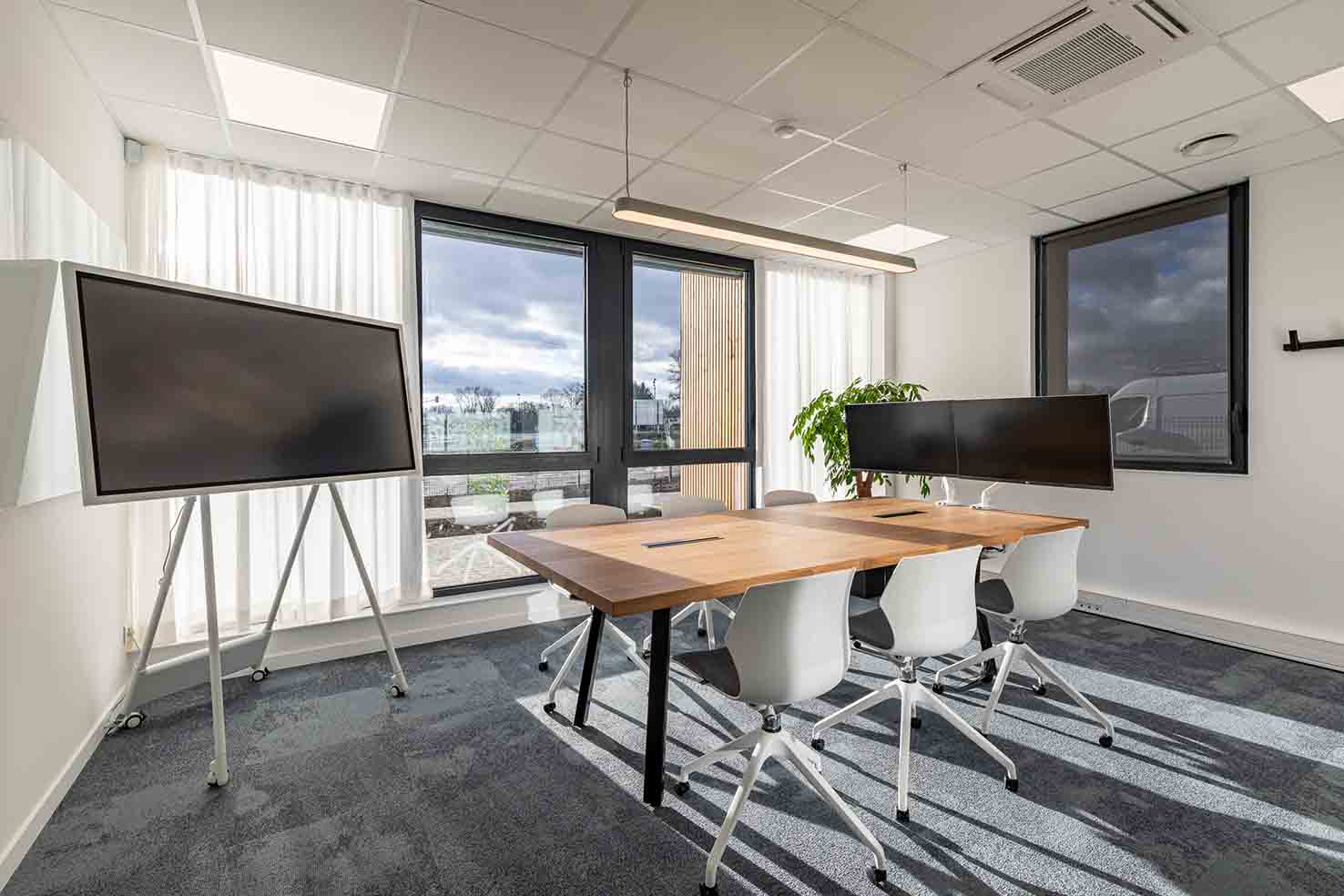 Pour répondre aux besoins d’échanges internationaux, neuf salles de visioconférence ont été aménagées sur mesure. Elles intègrent des cloisons amovibles vitrées pour préserver la lumière naturelle, complétées par une vitrophanie sur mesure garantissant la confidentialité.